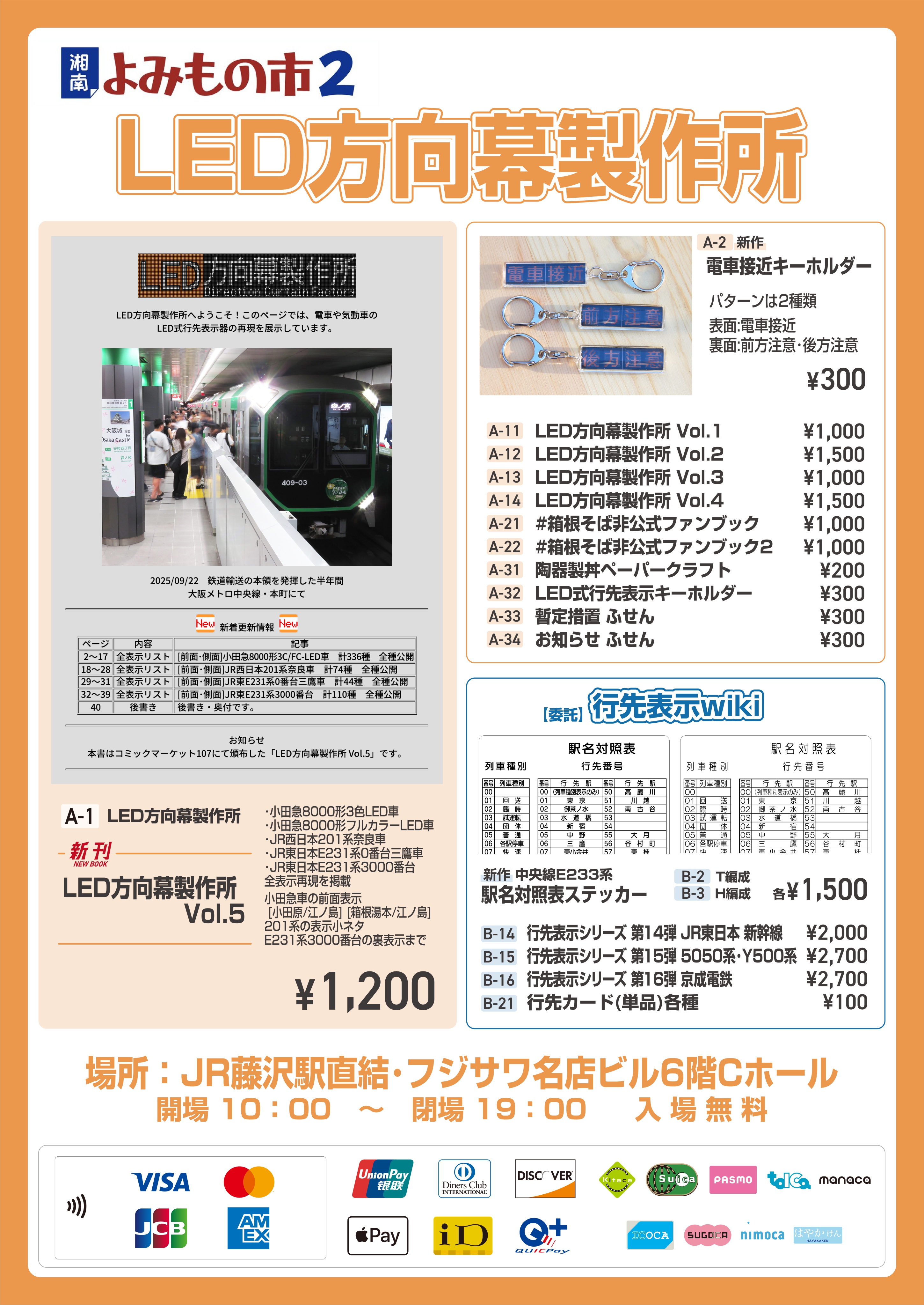 | 湘南よみもの市2参加のお知らせ LED方向幕製作所は、1月12日(月・祝)開催の「湘南よみもの市2」に出展いたします。 お品書きはこちら 第2回湘南よみもの市はこちら 「行先表示wiki」の既刊等の委託頒布もございます。 ※LED方向幕製作所が参加するイベントでの決済手段について※ 現金・交通系IC・各種クレジットカード・iD・QUICPayがお使いいただけます。 次回はコミックマーケット108に参加予定です。 |