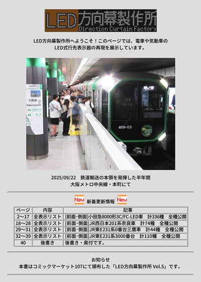 ●「LED方向幕製作所Vol.5」 1320円 C107発行 44P/B5/フルカラー 取扱サイト: BOOTH Melonbooks LED式行先表示器に関する内容いっぱい!小田急8000形3色LED車・小田急8000形フルカラーLED車・JR西日本201系奈良車・JR東日本 E231系0番台三鷹車・JR東日本E231系3000番台の全表示リストを詰め込んだ、こってりな一冊です。小田急8000形は通常目にすることができ ないフルカラーLED車の前面表示「小田原/江ノ島」「箱根湯本/江ノ島」や、惜しまれつつ引退したJR西日本201系の表示をドット単位で完全再現。 E231系3000番台は"裏"表示まですべて掲載しています。 |