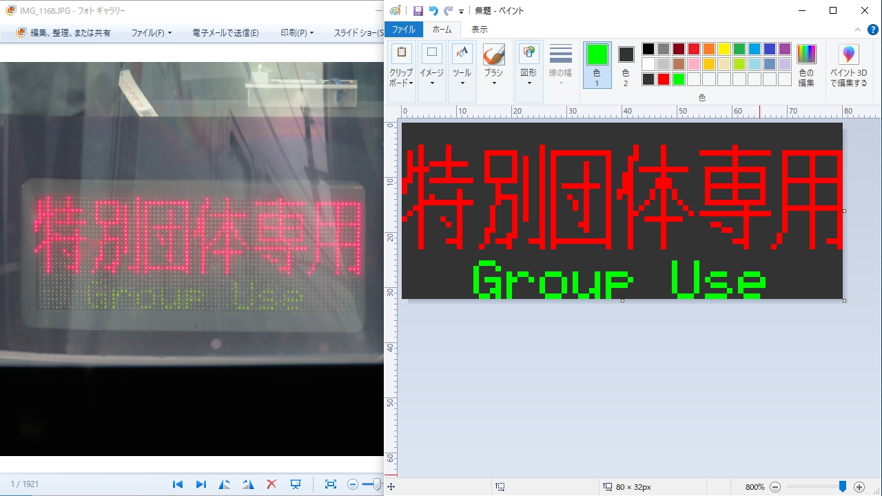 | 01.作る幕とキャンバスを用意する Windows付属のmspaintを使用して製作します。キャンバスの大きさは縦32ドット・横80ドット、下地は#333333、文字は#FF0000・#00FF00で描きます。 キャンバスの大きさはファイル>プロパティ(Ctrl+E)から変更できます。 |
